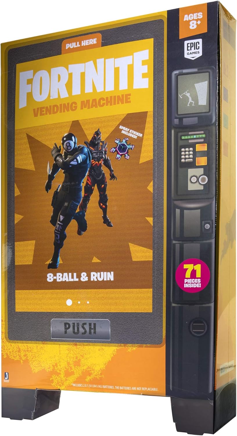 The Fortnite Large Vending Machine is busting open with the best loot from the game and brings the unboxing experience to the next level with 71 pieces including, 4-inch 8-Ball and Ruin action figures, Fortnite weapons of assorted rarities, Back Bling, a light-up Cozy Campfire and more!