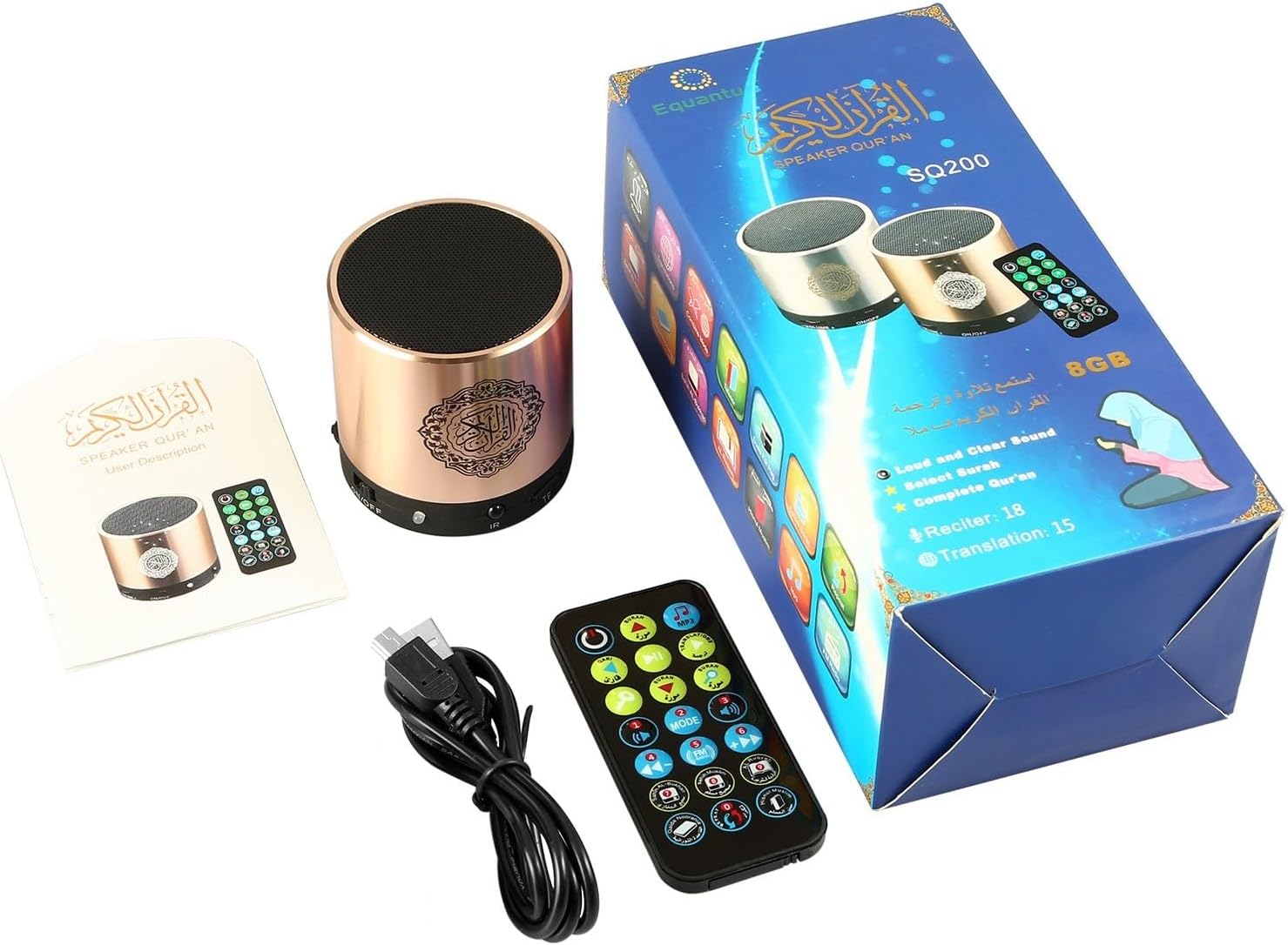 Portable Digital Quran Speaker with Remote Control over18 Reciters and 15 Translations Available,Perfect Gift for Family,Friends,and Colleagues Digital Quran Speaker has exquisite design, portable and nice, you can carry digital Quran Speaker in anywhere Digital Quran Speaker use the remote control to control and enjoy listening complete Qur'an to recite Digital Quran Speaker includes 18 Famous Different Imams and 15 Translations, you can choose what you need. Digital Quran speakers can help you learn the Quran more easily and enjoy the pleasure of listening. Packing List: 1 x Digital Quran Speaker 1 x USB Charger 1 x Remote 1 x User Manual Fast Surah Selection *Complete Tafseer Audio *Remote Control and Easy to Use *Quran Translation Audio (15 Languages) *HD Quality Quran Recitation Audio (18 Voices) Specification: Color: Silver Flashing Memory:8G Function:FM Radio, Voice Recorder,MP3 Player The digital Quran speaker is an ideal gift for Eid al Fitr, an ideal choice for Quran enthusiasts and family,and a joyful way to relax.