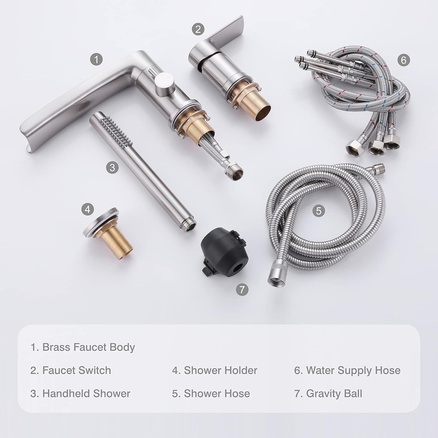 • 【Premium Solid Brass with PVD Finish】: This roman tub faucet Features a durable solid brass construction with an elegant, wear-resistant Brushed Nickel PVD coating for lasting beauty and reliability.