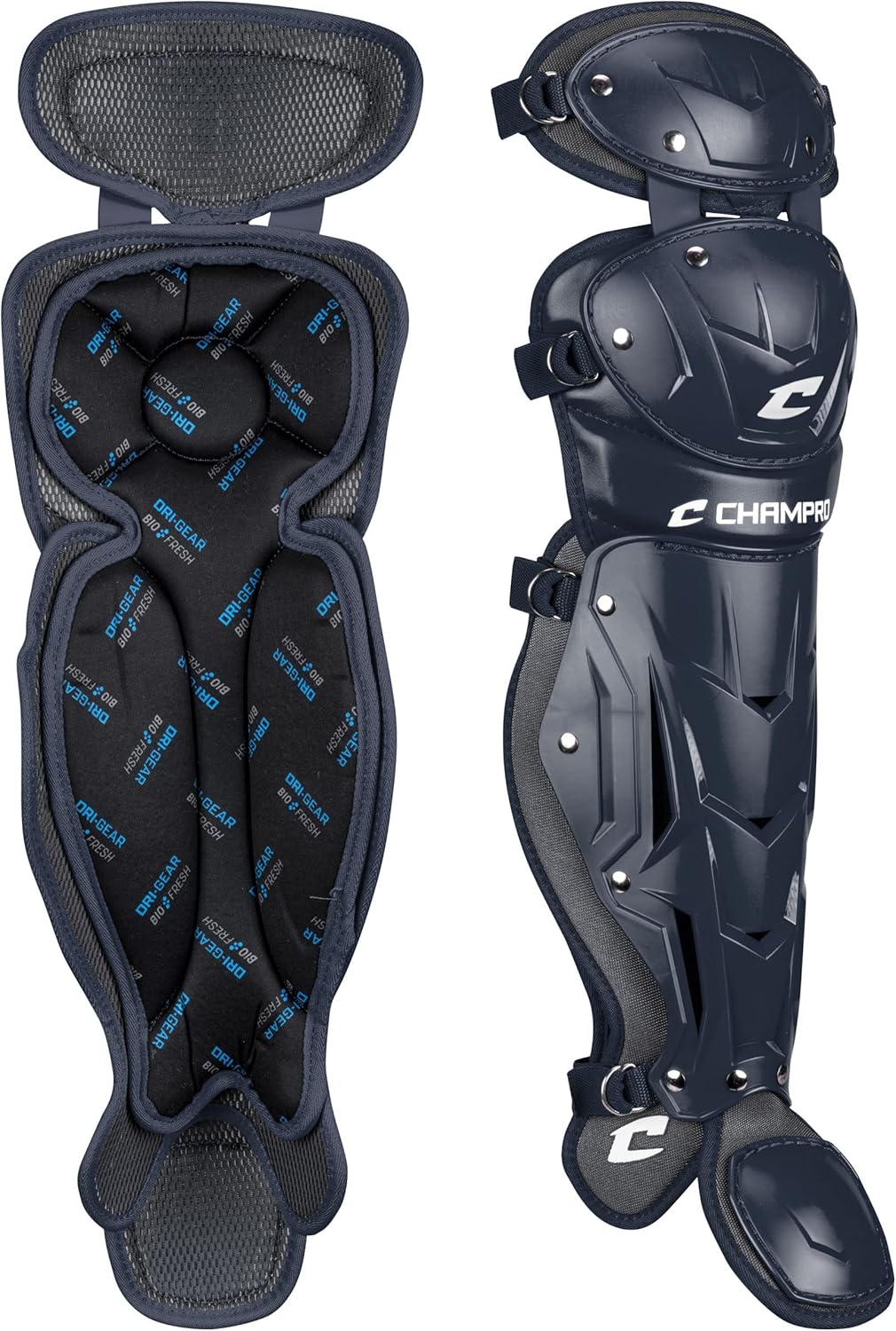 The CHAMPRO Optimus Pro Leg Guards combine ease of movement and protective strength. High-performance polyethylene makes the shin plates flexible and durable while maintaining a light weight. The cantilever-shaped lining system spreads the shock of impact and minimizes force transferred to the catcher’s shins. A double knee covering the upper leg and wings over the calf and ankle provide protection for most of the leg. Optimus Pro Leg Guards are also built with athlete comfort in mind; air flows through the ventilation holes to cool catchers and prevent heat buildup during play, while the contour-molded adjustable Dri-Gear liner wicks away moisture and helps keep catchers comfortable and dry on hot days. A Bio-Fresh treatment provides an extra level of freshness preservation. The Senior League size (14. 5” shin length) is available in 4 colors: Black, Navy Blue, Royal Blue, and Scarlet Red.