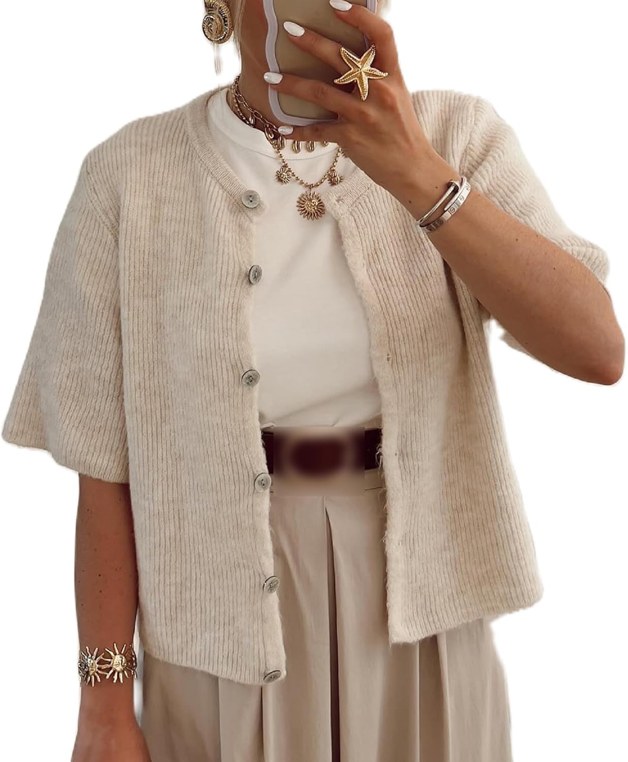 KMBANGI Women Knitted Cropped Blouse Short Sleeve Button Down Knit Crop Shirt Cardigan Y2k Open Front Pullover Tops Available for woman, teens, juniors, best friends, sisters, gifts for daughter, girlfriend, wife, ladies. Notes: 1. The above data are manually measured, and an error of 1-2 cm is allowed. 2. Due to different displays and lights, there may be errors in colors. Please refer to the actual items. Package Contents KMBANGI Women Knitted Cropped Blouse Short Sleeve Button Down Knit Crop Shirt Cardigan Y2k Open Front Pullover Tops