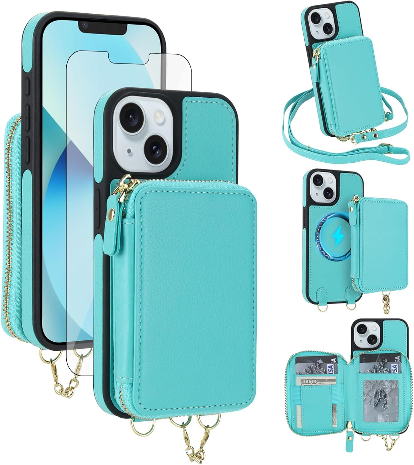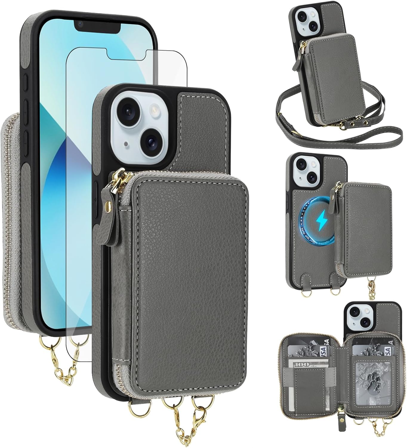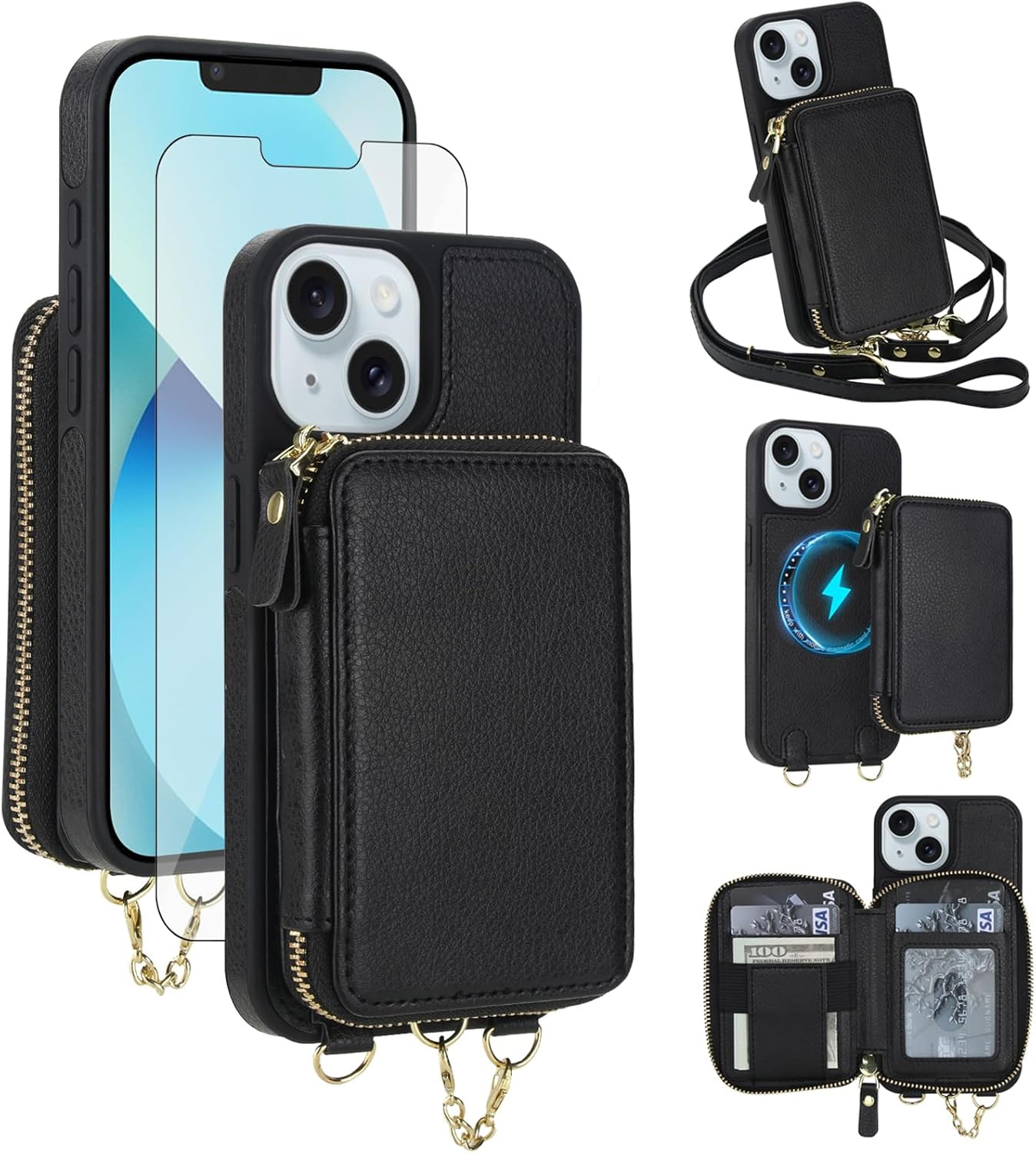 【Compatible Models】: Compatible with iPhone 13 / iPhone 14 (6.1 inch), NOT compatible with other devices.【Package includes】: We will send the phone case with 1 piece tempered glass screen protector + 1 detachable crossbody strap. This case is made of high-quality durable PU leather above odor. It would be a nice gift for your lover, your family and your friends.【RFID Blocking Material】:The information data in the chips of your cards can be read and copied by RFID technology through radio signals. In this case, your cards are not safe enough even though they are in your pocket. RFID block material applied to our purse case can effectively avoid such problems and keep your cards safe.