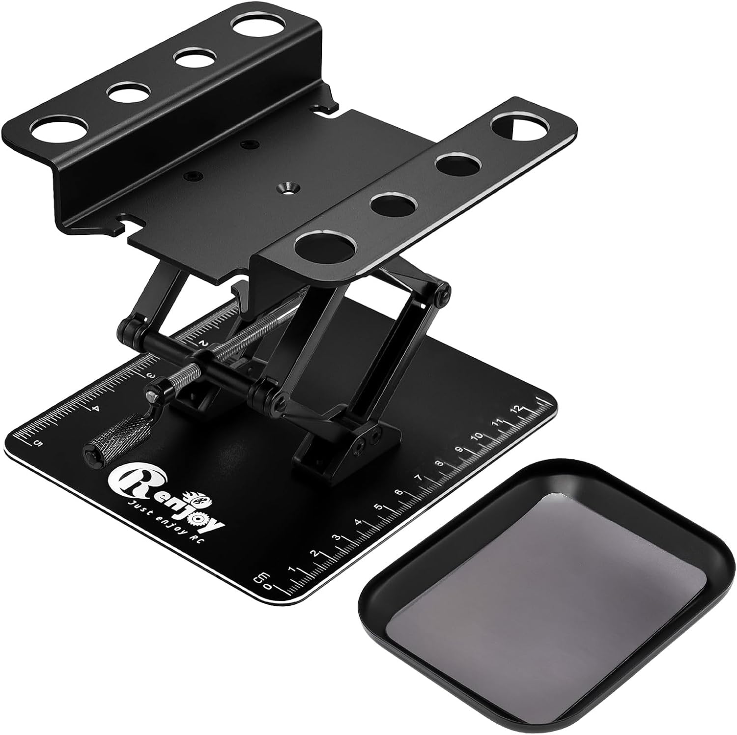 Features:Wide Compatibility: This rc car work stand is suitable for 1/8 1/10 1/12 RC Cars Trucks and CrawlersAdjustable Height: With adjustable height of 58-137mm / 2.28-5.39in allows you to find a comfortable position to repair your rc modelEasily Adjustable: Comes with roker arm, it's easy and convenient to adjust the height of work standSilicone Working Mat: Protects table from scratches, oil, grease and debris. Flat, easy-clean edges keep the workspace tidy.Multifunction: Various-sized slots on the mat and the screw tray can hold screws and hardware separately to avoid loss. Printed scale enables quick, accurate length measurements for precise assembly and repairs.Specification:Material: Aluminum AlloyColor: Black/Red/Blue/GreenLength: 5.5inch / 140mmWidth: 4.72inch / 120mmHeight range: 2.28-5.39 inch / 58-137mmWorking Mat: 13.74 * 8.66 inch / 349 * 220mmPackage List:1 * RC Car Repair Work Stand1 * Screw Tray1 * Silicone Working Mat