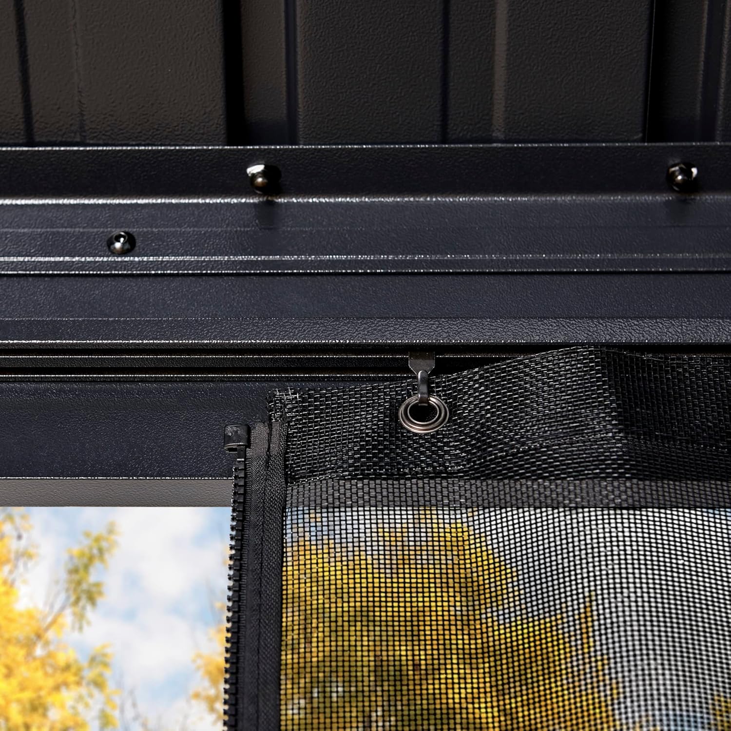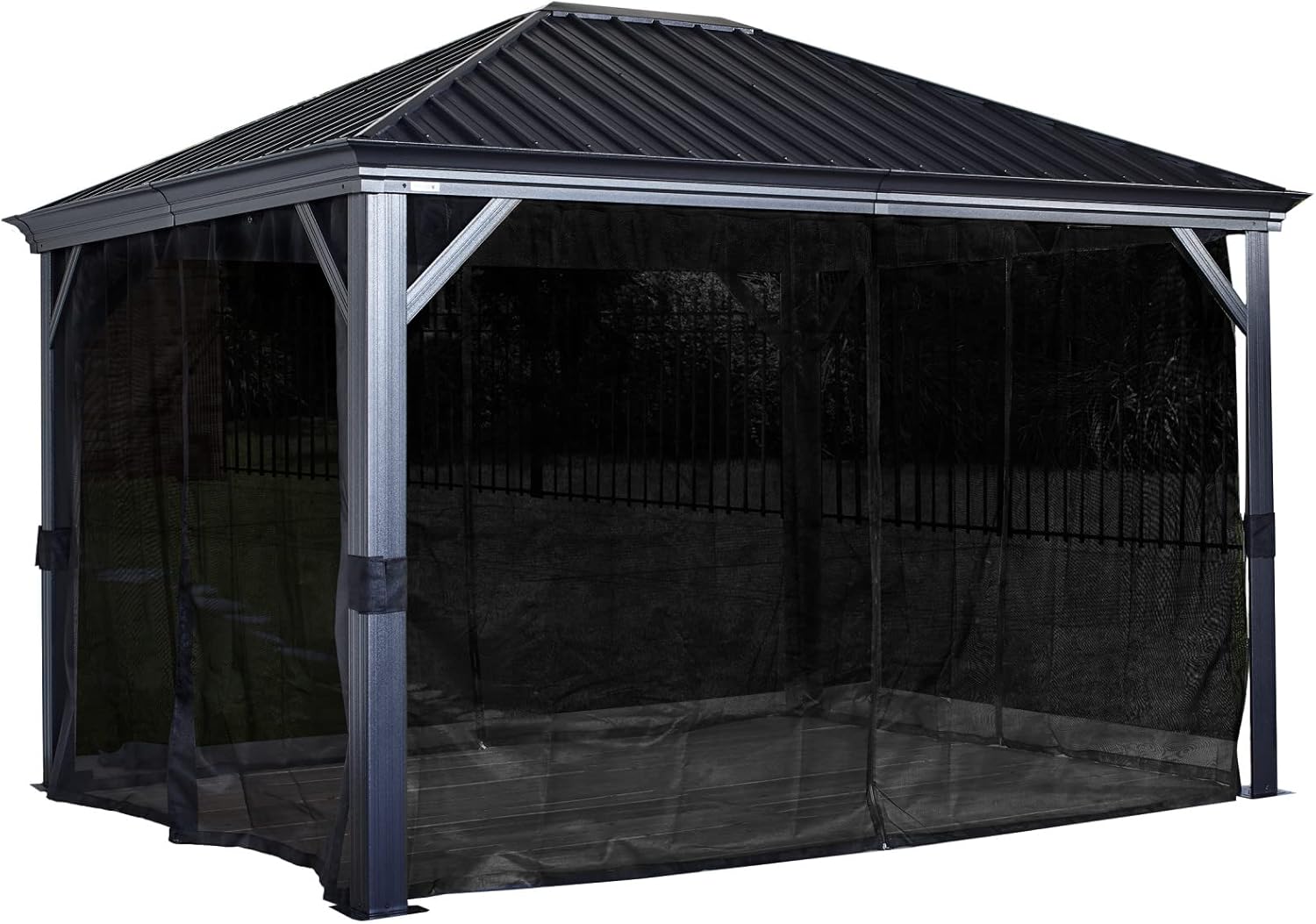 Improve your outdoor setting with a gazebo that stays up all year long. The Sojag Marsala is perfect for those who enjoy a nicely shaded environment on a hot summer day or the feeling of a warm breeze on a summer night. The frame is crafted with a premium black aluminum, which is coated with AkzoNobel’s Interpon powder-coating. This coating provides protection from fading, scratching, and corrosion. The extruded aluminum frame offers reinforcement and enhanced strength and durability. The Marsala includes a PVC-coated polyester mesh mosquito net to keep your space free from pesky bugs and reduces wind and sun exposure. The Double Track system allows you to hang outdoor curtains for added privacy (sold separately). In addition to its functional design, the Marsala is a beautiful gazebo that will add to the elegance of your backyard. Sojag does recommend removing any snow accumulation from the gazebo roof to preserve the durability and stability of your outdoor gazebo. Assembly is made quick with easy-to-follow instructions and Sojag recommends 2 people for assembly. The outdoor gazebo measures 117.3" W x 166.5" D x 109.5" H.